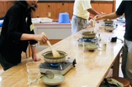 藻塩体験コーナーでは、能登式製塩土器のミニチュアを使った土器製塩が体験できます。ただし、雨の日や風が強い日には実施できません。そこで、屋内で土鍋を使った塩づくりが体験できるように準備しています。